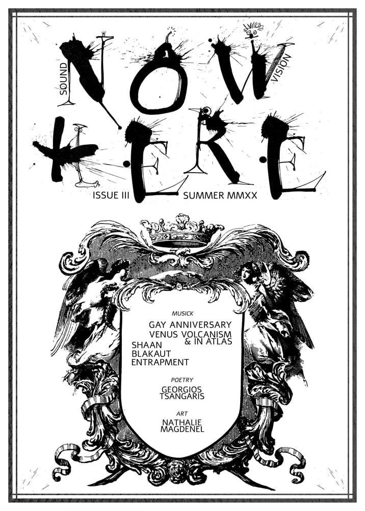 After almost a decade since the last issue, Nowhere zine is back! A slicker and cleaner look, with a more electric and electronic sound. Synth-techno master BLAKAUT (Athens) talks about the documentary and political power of music; galvanizing electro-feminism duet VENUS VOLCANISM & IN ATLAS ponder the role of love in the revolution (Crete/Denmark); analog techno priestess ENTRAPMENT (Oakland, CA) debates the freedom found within electronics and the US underground techno scene; fuckwave punks GAY ANNIVERSARY (Volos in Athens) discuss their new (masterpiece) album and share their secrets on how to avoid becoming a failed success; cerebral analog electronics sorceress SHAAN (Serbia) takes us on a trip through her hometown and her local underground scene; mystic visual artist NATHALIE MAGDENEL (Valencia) takes us on her journeys as a travelling tattoo artist; and Greek-American punk poet GEORGIOS TSANGARIS shows us the importance of being earnest with his honest verses. Bonus: a Greek Punk crossword puzzle to test your knowledge of Greek punk.
